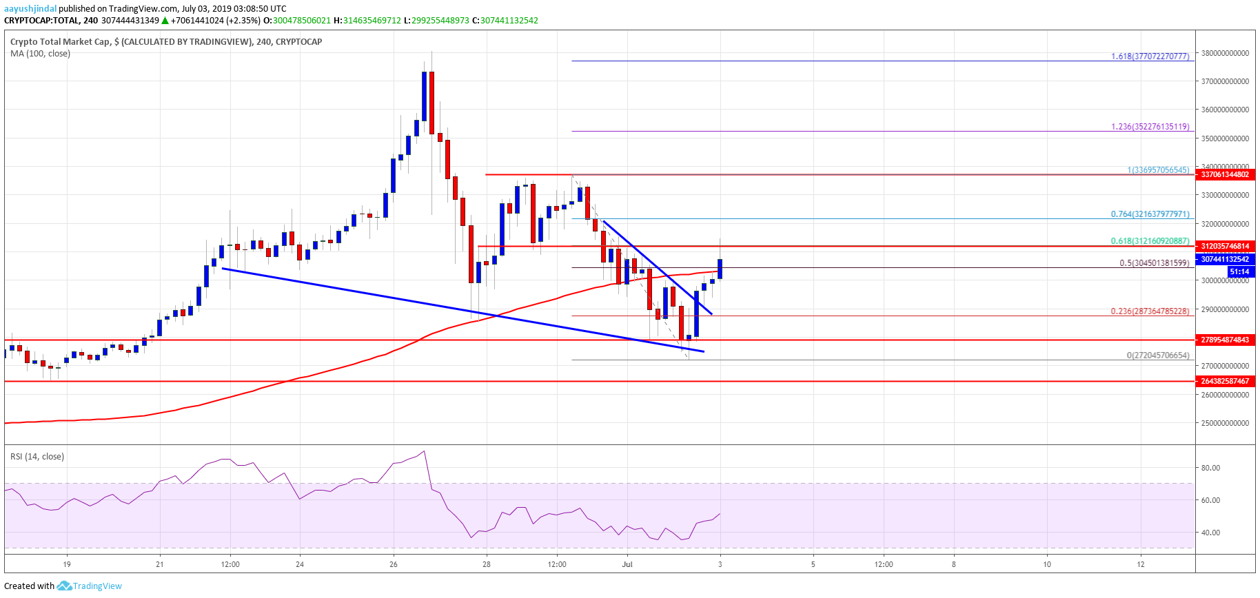 Looking at the total cryptocurrency market cap hourly chart, there was a major decline below the $300.0B support area. However, the $272.0B and $270.0B levels acted as strong supports. The market cap start a strong recovery and climbed back above the $285.0B and $290.0B resistance levels. It even broke the $300.0B barrier and it seems to be facing hurdles near the $310.0B level. If there is an upside break above the $310.0B resistance, there could be a decent upward move in bitcoin, Ethereum, EOS, litecoin, ripple, ADA, BCH, XLM, BNB, TRX, XMR, and other altcoins.