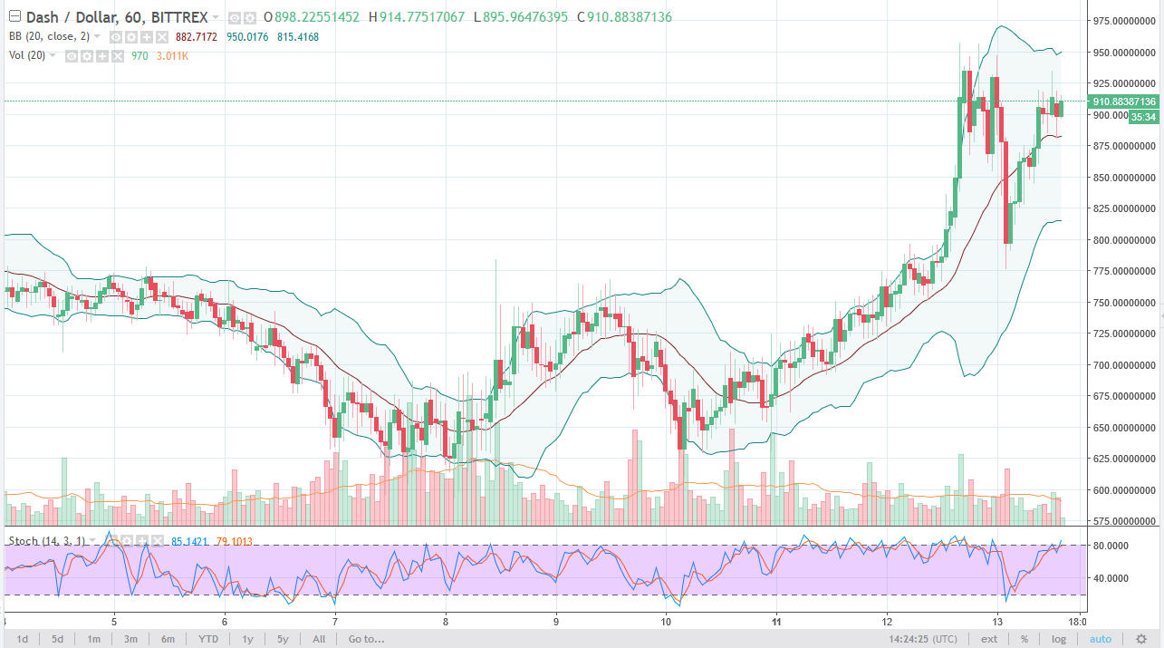 DASH continues to be very noisy during the trading session on Wednesday, reaching towards the $925 handle. We are a bit overbought at this point, so I would expect more short-term pullbacks, with an eventual eye on the $1000 handle above. I have no interest in shorting.