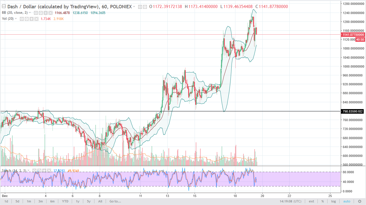 DASH continues to look bullish overall, but did suffer a significant pullback at the highs during the trading session on Tuesday. Because of this, I think we are trying to dip a little bit lower to look for more support, and then extend towards the $1250 level. We have seen in overextension of the market as of late, so it’s not a huge surprise to see this market pull back a bit.