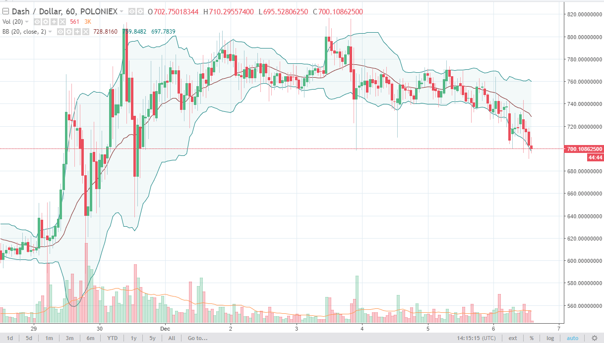 DASH continues to drift a bit lower during the Wednesday session, as we are looking at the $700 level as support. I believe there is massive support underneath, especially near the $680 level. I’m waiting to see a bounce above the $725 level to start nibbling at the market again, so at this point I suspect we may have some grinding in a somewhat sideways fashion to do.