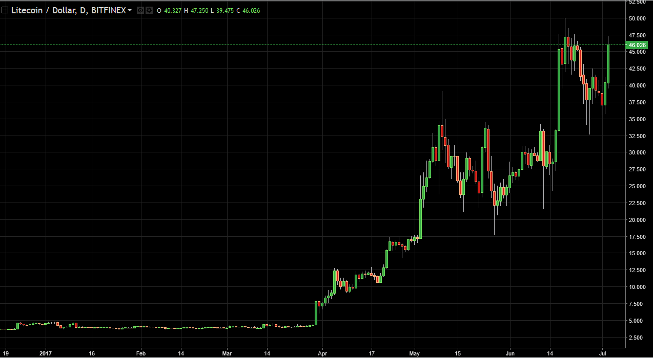 LiteCoin exploded to the upside on Monday, reaching towards the $47.50 level. The $40 level being broken to the upside is a very bullish sign, just as the $42.50 level has been. With this bullish candle, I believe that short-term pullbacks will continue to offer buying opportunities and then attract more order flow.