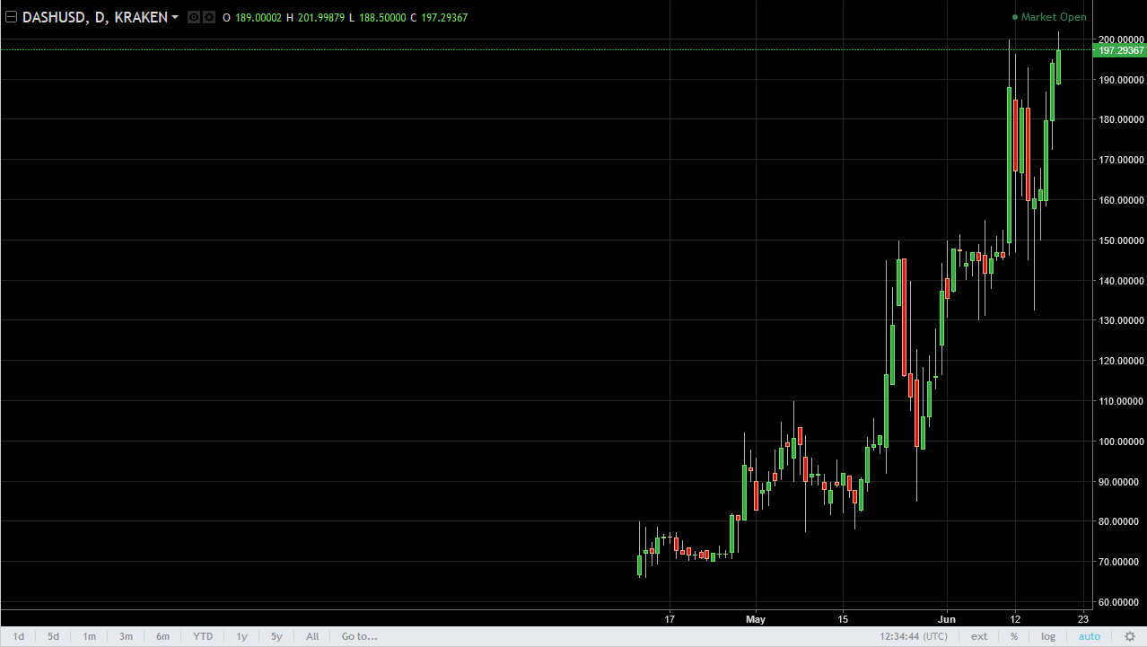 The DASH market rallied during the day on Monday, touching the $200 level. This is a barrier that is a large, round, psychologically important number. If we can break above their, the market can go much higher, and perhaps start the next leg higher. A pullback from here should find plenty of support underneath, and because of this I believe that traders will be looking for value going forward.