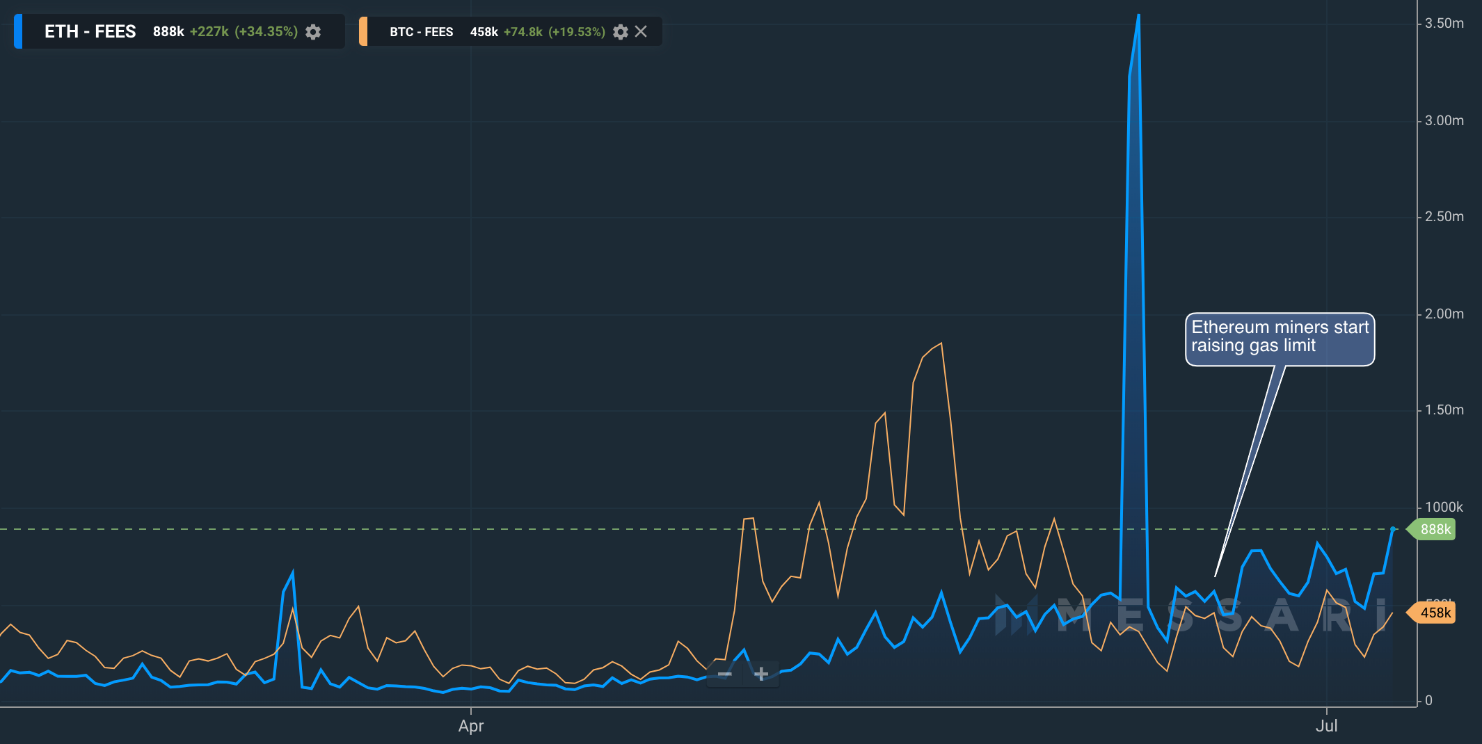The uptick pointed to a more significant amount of transactional throughput across the ETH blockchain. It led miners to raise their gas limits by 25 percent back in June, thereby causing the fees per block to increase in tandem.