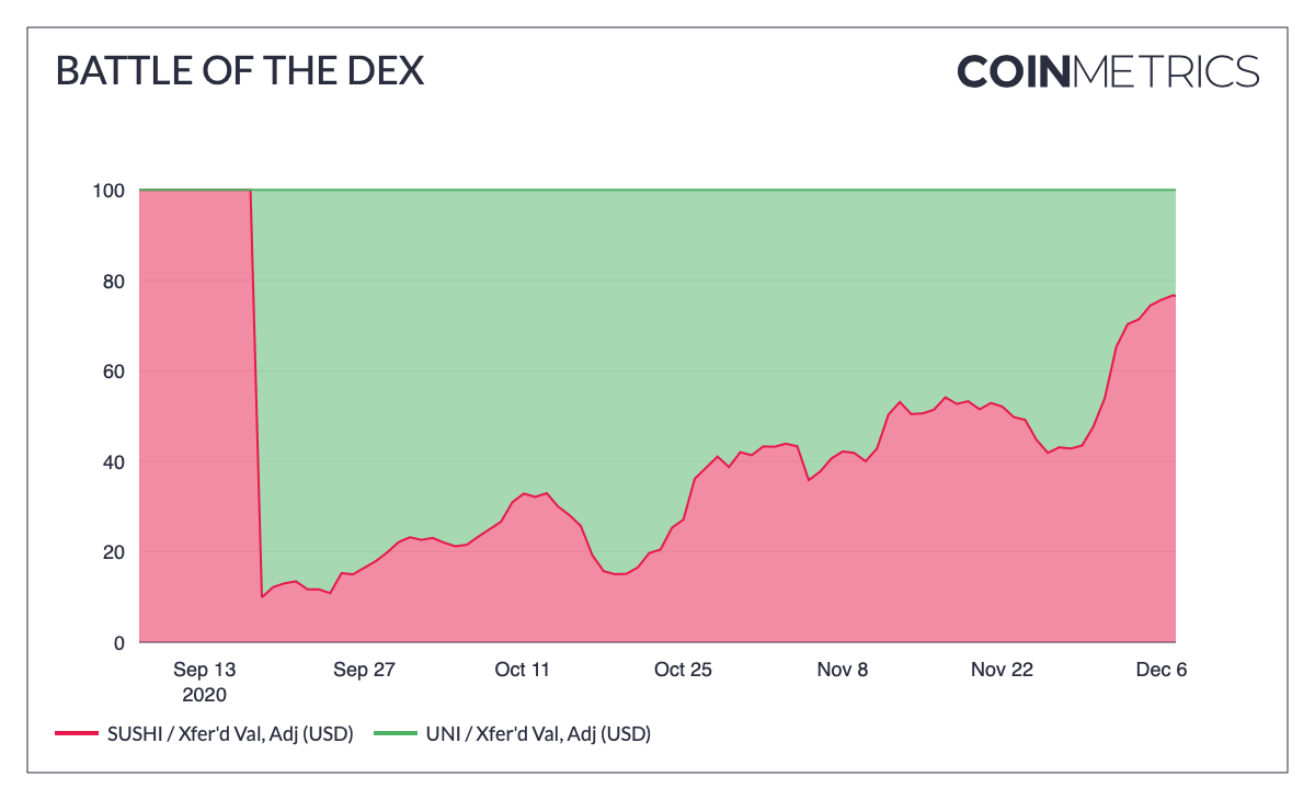 SushiSwap's SUSHI (green) vs UniSwaps UNI (red) value transferred adjusted in the US dollar. Source: Coin Metrics