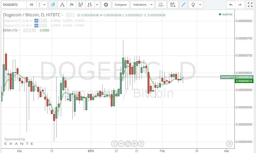 By studying the 1 day Hitbtc (Doge/BTC) from tradingview.com (look at the below chart), we can see that dogecoin price has been trading between 62 and 65 satoshis last week. The price is going away from the 52 satoshis support level as per our Fibonacci retracements that we plotted a couple of weeks ago as shown by an upwards sloping 10 day EMA on the 1 day charts (the green curve running through the candlesticks on the below chart).