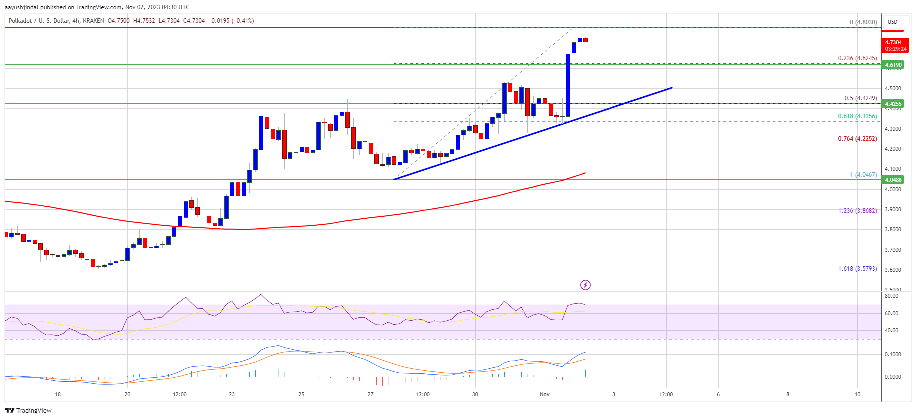 Polkadot cleared the $4.50 resistance zone and the 100 simple moving average (4 hours). It traded to a new multi-week high at $4.803 and is now consolidating gains. It is well above the 23.6% Fib retracement level of the upward move from the $4.046 swing low to the $4.803 high.