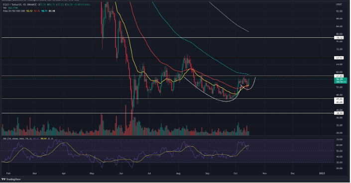 Elrond has successfully increased its September 28 price of $45.43 by 10% to trade at $55.65.