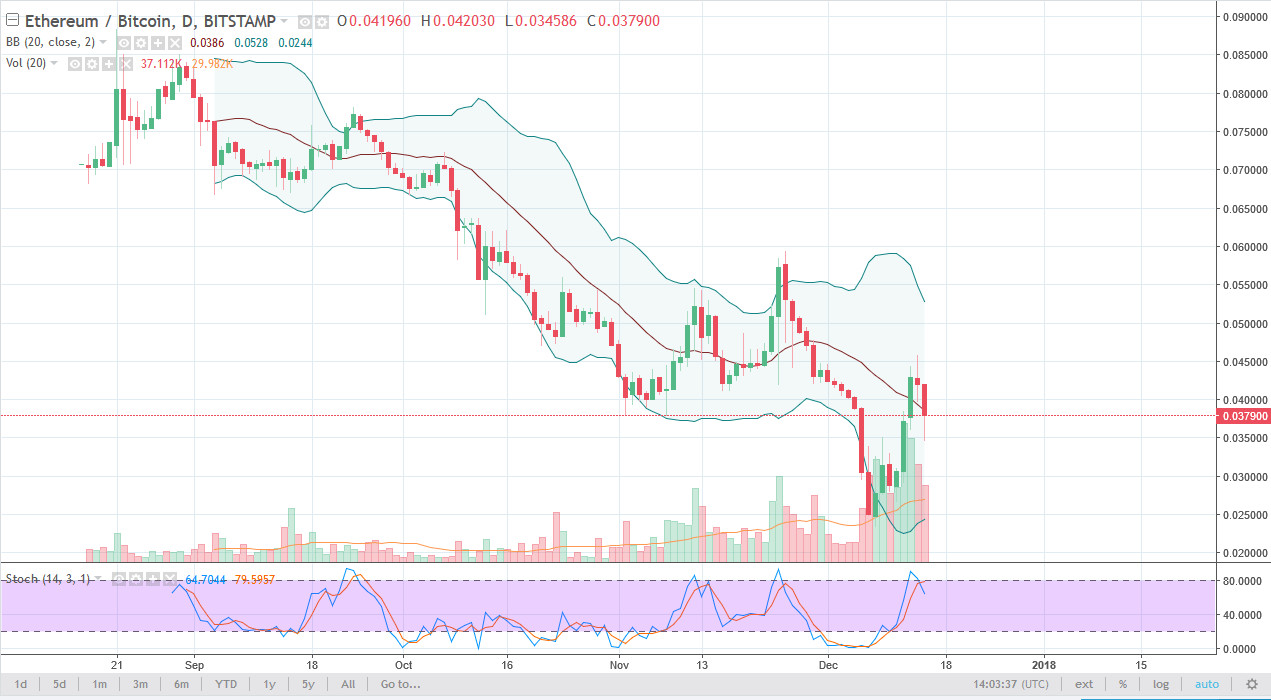 Ethereum broke down against Bitcoin, and now that we are below the 0.04 level, and of course Bitcoin is rallying significantly, I believe that this market will continue the downward trajectory, perhaps reaching as low as the 0.025 level underneath.
