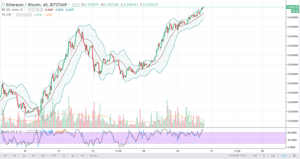 Ethereum markets have rallied again during the trading session on Thursday against Bitcoin, and as I record this, Bitcoin looks very vulnerable in general. Because of this, I suspect that every time we pull back in this market there will be buyers below. We have essentially “flipped a major area” by breaking above the 0.05 handle, and as long as we are above that level, it’s a buy on the dip type of mentality.