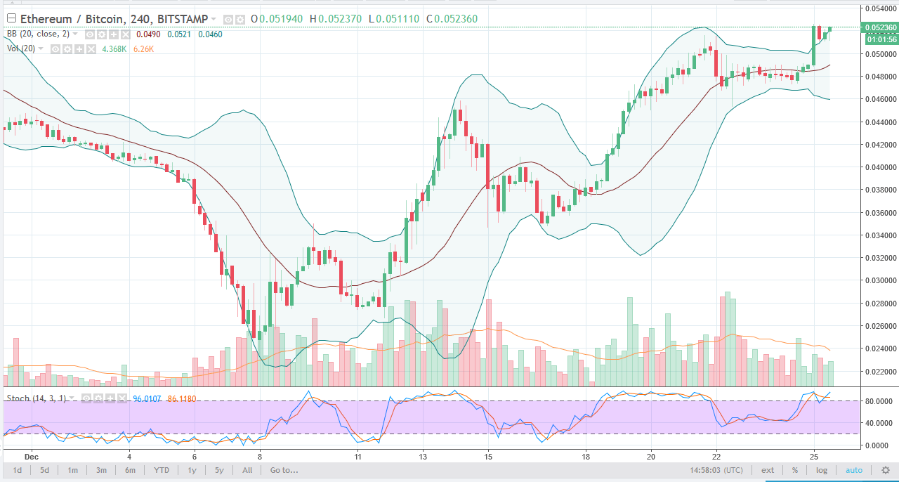 With Bitcoin falling as hard as it has been lately, it’s no surprise that this market continues to gain. The question is how much farther can we go? At this point, I don’t have the answer, but I do realize that if we are above the 0.05 level, there is going to be a certain amount of psychological support from that fact. Because of this, buying on the dips in small increments might still be the best way to deal with the ETH/BTC pair.