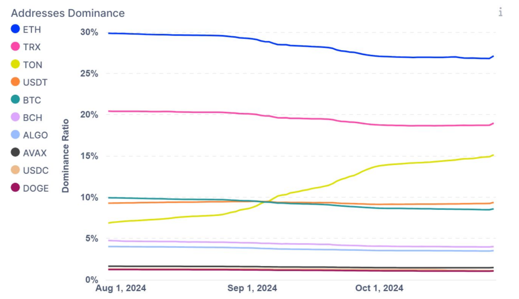 Tron comes in second, with a 27% share of all active addresses. TON by Telegram is also in the Top 5 list of InTheBlock as of October 1st, and it offers an interesting picture of an increasing user base.