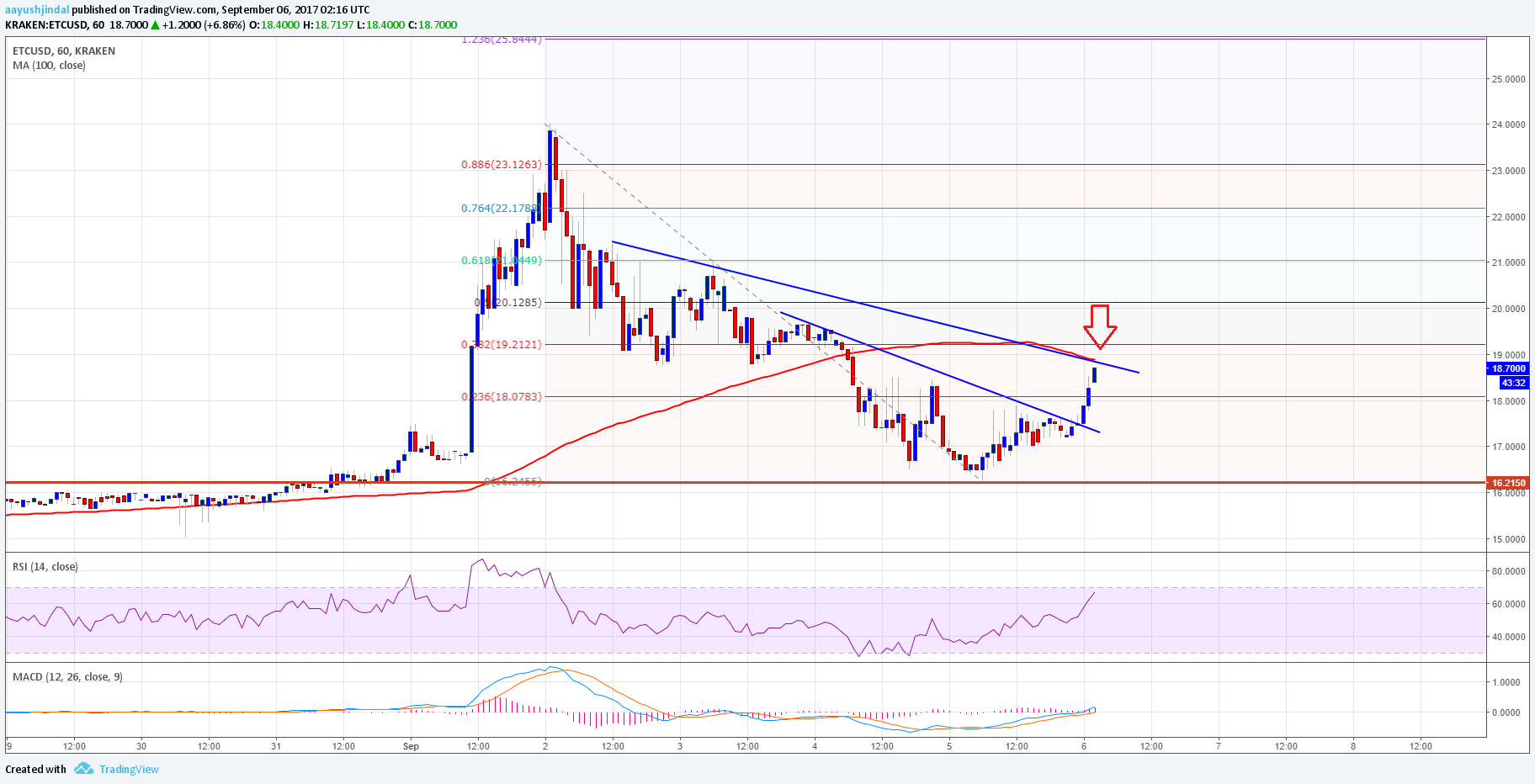 Similar to BCH, BTC and ETH, there was a sharp decline in ETC price towards $16.00 against the US Dollar. The price traded as low as $16.24 where it formed a decent support. After forming support, the price started recovering above $17.00. First, it broke the 23.6% Fib retracement level of the last decline from the $24.00 high to $16.24 low. It cleared the way for more gains above $17.00 in the near term.
