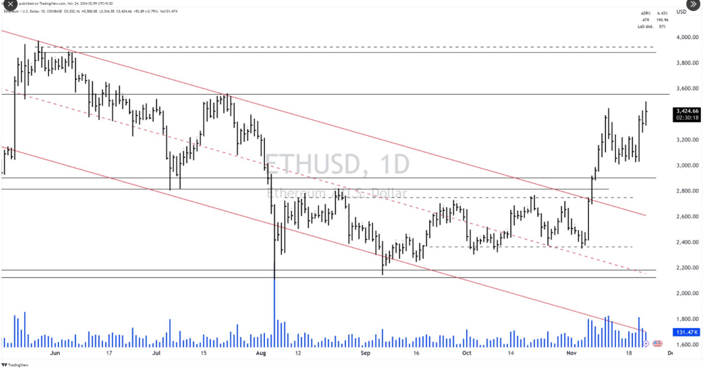 This is how the price should behave when it breaks out of the descending trend channel. #crypto #Ethereum pic.twitter.com/tepsK7grmO— Logical Trader (@logicaltra6er) November 23, 2024