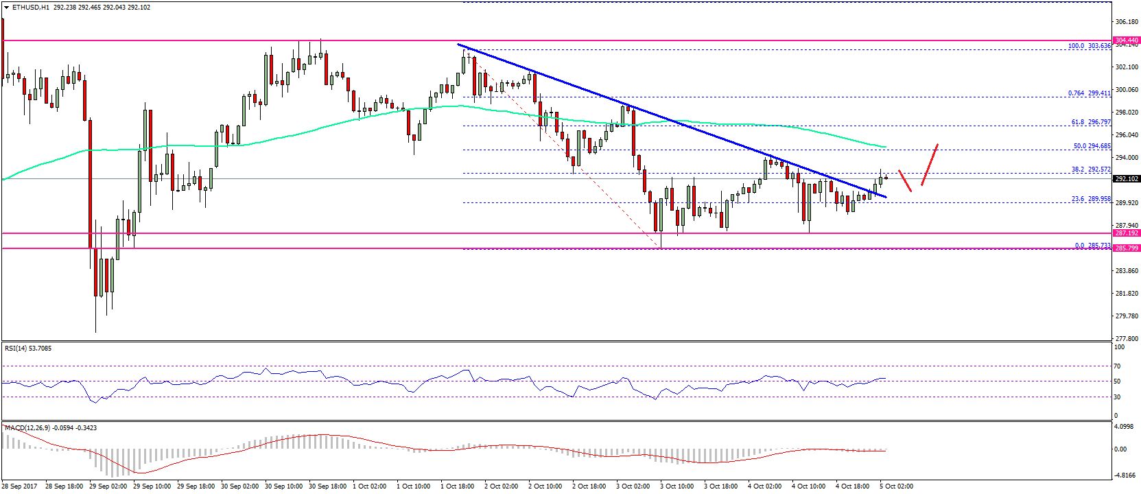 There were multiple attempts to break the $287-286 support zone in ETH price against the US Dollar. The price formed a decent support at $286 and started an upside move. It broke the 23.6% Fib retracement level of the last decline from the $303.63 high to $285.75 low. Moreover, there was a break above a key bearish trend line with resistance at $290 on the hourly chart of ETH/USD. These are positive signs above $290, but the pair is lacking momentum.