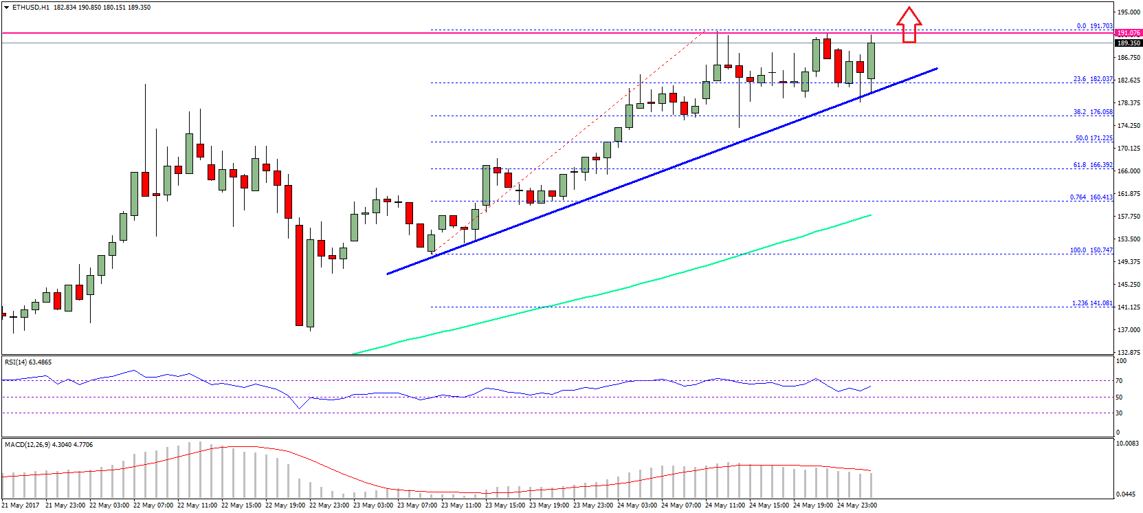 Earlier, there was a test of the 38.2% Fib retracement level of the last wave from the $150.74 low to $191.70 high. So, we can say that the price completed a correction near $182, and about to break higher. On the downside, there is a solid bullish trend line with support at $182 formed on the hourly chart of ETH/USD. It may continue to act as a support and prevent downsides below $180.