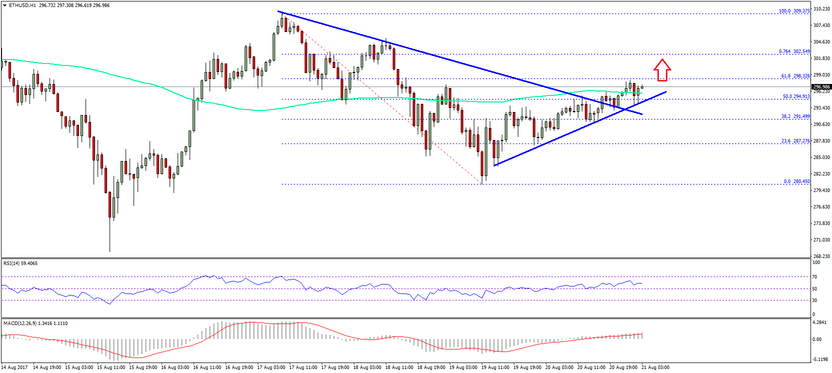 During the upside move, there was a break above a connecting bearish trend line at $292 on the hourly chart of ETH/USD. The price is now comfortably placed above the $292 level and the 100 hourly simple moving average. It is also above the 50% Fib retracement level of the last decline from the $309.37 high to $280.45 low, which is a bullish sign. Sooner or later, the price would move above $300 and attempt more gains in the near term.