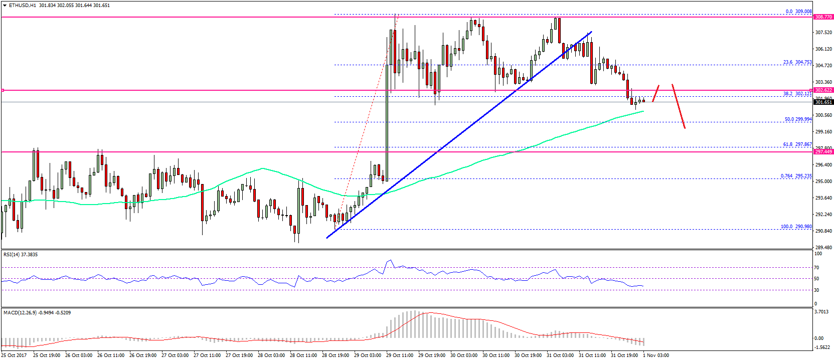 There was no upside break in ETH price above the $309 level against the US Dollar. The price started a downside move and broke the 23.6% Fib retracement level of the last wave up from the $290.98 low to $309.08 high. The downside wave was such that the price failed to hold an important support and traded towards $301. During the downside move, there was a break below yesterday’s highlighted short-term bullish trend line with support at $305 on the hourly chart of ETH/USD.