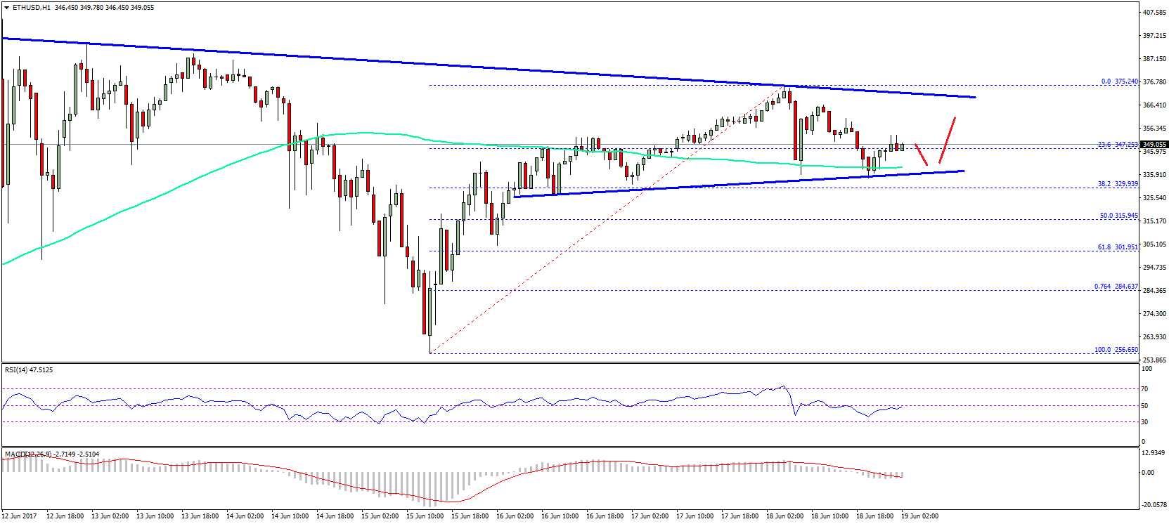 We witnessed a decent recovery from the $256.65 low in ETH price against the US Dollar. The price moved higher above the $340 and $350 resistance levels and recently traded close to the $375 level. It faced sellers near $375 and started a correction. Actually, a connecting bearish trend line with resistance at $370 on the hourly chart of ETH/USD acted as a hurdle. It pushed the price below the 23.6% Fib retracement level of the last wave from the $256 low to $375 high.