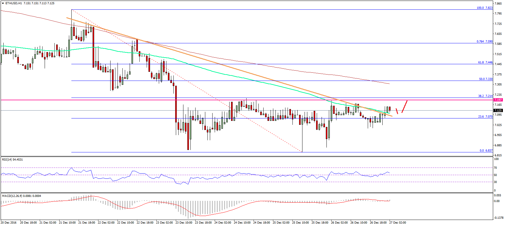 Yesterday, I highlighted a bearish trend line on the hourly chart (data feed via SimpleFX) of ETH/USD. It was acting as a resistance. However, the pair later managed to clear the trend line resistance at $7.08. Moreover, there was a close above the 100 hourly simple moving average. These two are positive signs, but there is a concern. There was no real momentum after the break. And, the price is still below a major pivot area of $7.20. Unless there is a break above the mentioned pivot level, the price remains at a risk.