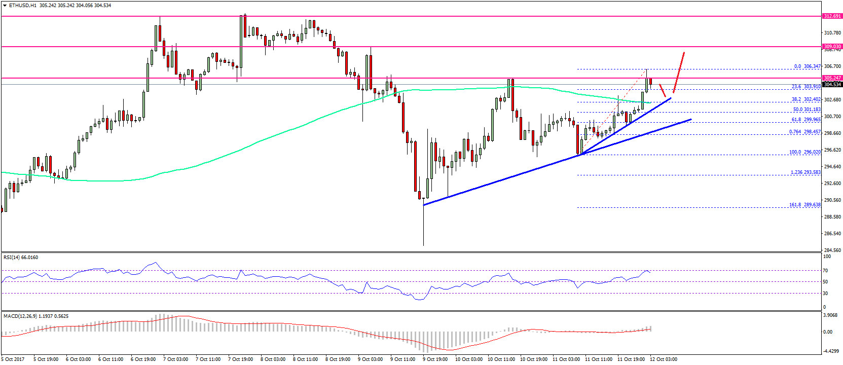 It seems like ETH price is not willing to make a decisive move in an easy way above $315 against the US Dollar. The price traded in a range, but remains above the $298 level. There was a slow and steady rise above the $300 level. Buyers succeeded in clearing the $304 resistance for a short-term high at $306.34. The best part was close above the 100 hourly simple moving average and $300.