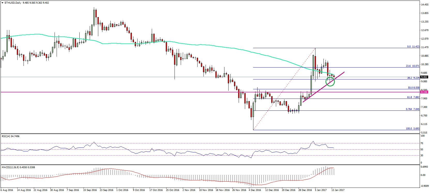It also was a major factor of the price not able to gain pace above $10.00. At the moment, the price is trading near a major support zone. There is a tiny connecting bullish trend line formed on the daily chart (data feed via SimpleFX) of ETH/USD. It is acting as a support along with the 38.2% Fib retracement level of the last wave from the $5.69 low to $11.42 high. As long as the price is above it, there can be an attempt to trade higher once again.