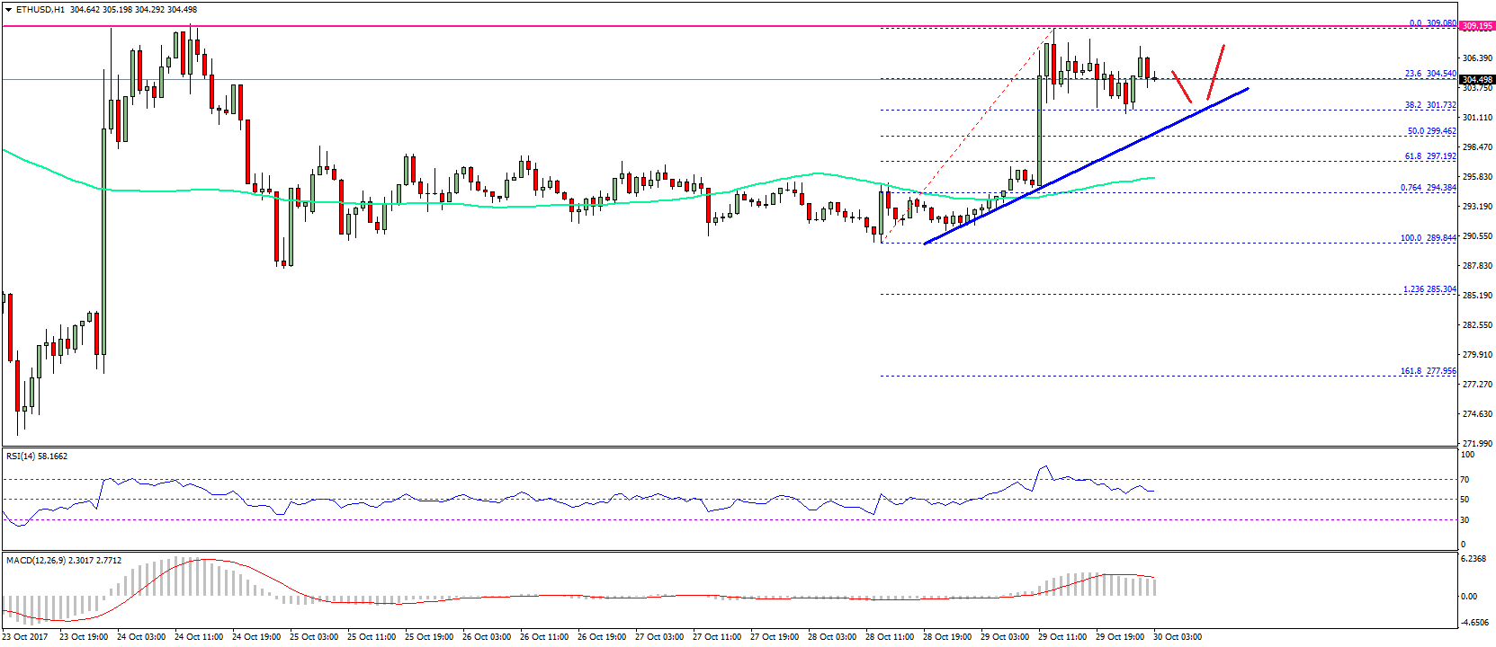 There was a nice upside move in ETH price during the past two sessions above $300 against the US Dollar. The price traded higher and broke the $301 resistance to trade towards the next resistance at $309. The mentioned $309 resistance prevented gains once again and stopped buyers from taking control. There was a rejection and the price started correcting lower towards $301-300. It has moved below the 23.6% Fib retracement level of the last wave from the $289.84 low to $309.08 high.