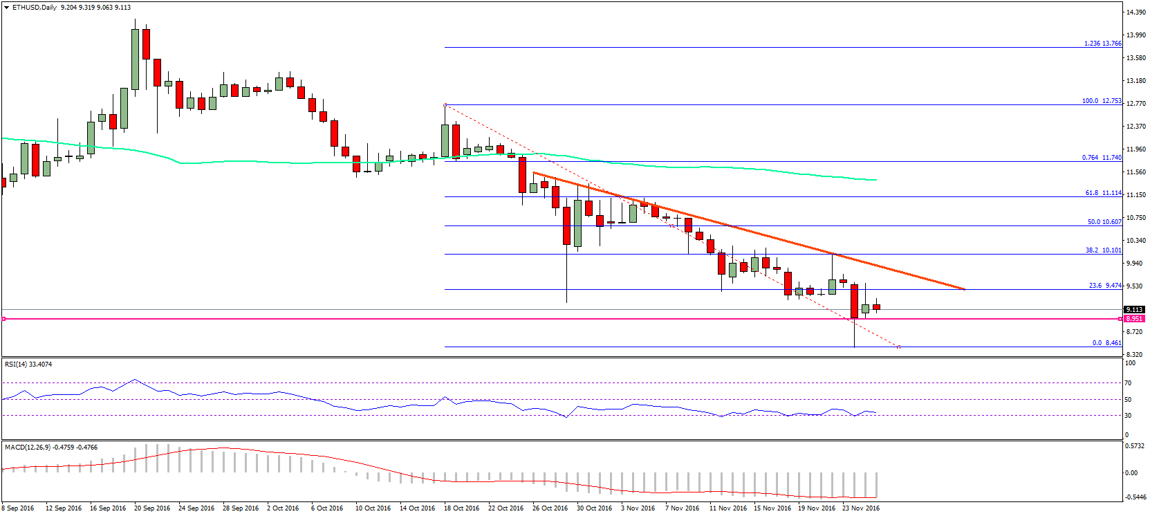 It was a bad week for ETH price, as it declined heavily against the US Dollar and Bitcoin. There was an increase in the bearish pressure, igniting downside move in ETH/USD and ETH/BTC. The ETH/USD pair even traded towards $8.46 before correcting a few points. On the upside, there is a crucial bearish trend line formed on the daily chart of ETH/USD (data feed via SimpleFX).