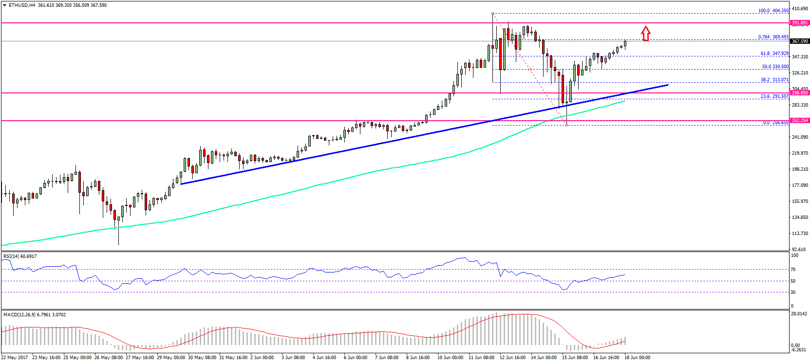 Ethereum price correction was a good thing against the US Dollar and Bitcoin, and now ETH/USD is back in the bullish zone for a break above $400.
