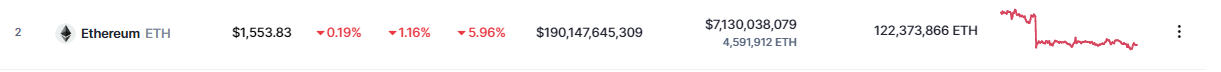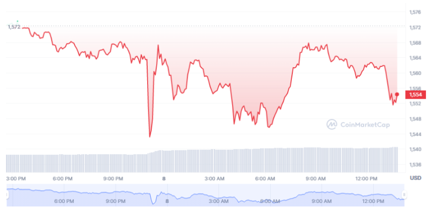 According to CoinMarketCap, the price of Ethereum went down by 6% in the weekly timeframe, and trading at $1,554.