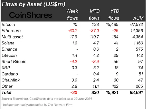 According to CoinShares, digital asset investment products saw $30 million in outflows last week, the third consecutive week of outflows. Ethereum saw its largest outflow since August 2022, totaling $61 million, making it the worst performing digital asset investment product so…