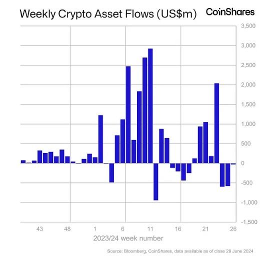 There are geographical differences in investor attitude, even though the general trend is cautious. For instance, the United States had $43 million in inflows, defying the worldwide trend and indicating ongoing interest in the digital asset market by Americans.