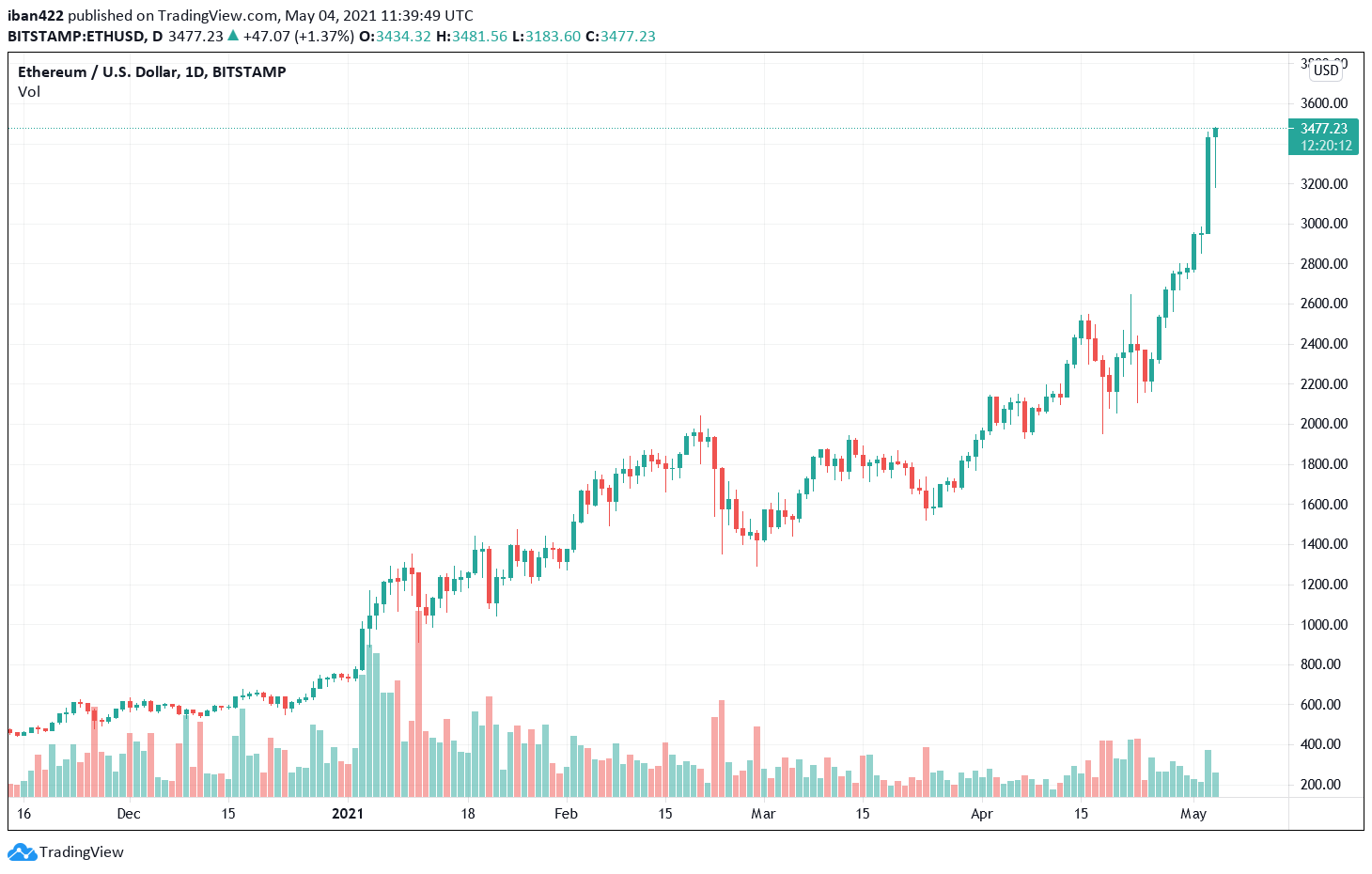 For the last few days, Ethereum has been adding incredible returns for investors. According to CoinMarketCap, on Monday, ETH added over 16% pushing the coin to a new record of slightly over $3,450. At the time of writing, the coin was trading at around $3,470, a gain of 9.43% over the last 24 hours.