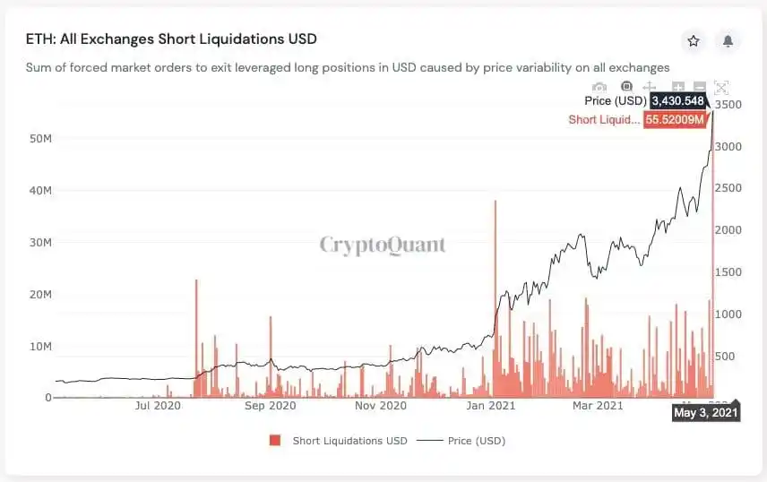 In the case of Ethereum, the last 24 hours has seen all-time high short liquidations across all derivative exchanges. According to cryptoanalysis firm, CryptoQuant, the cryptocurrency liquidations reached about $55 million in exit leveraged long positions causing the price to surge to a new record high.