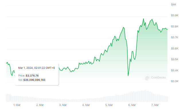 At the time of writing, Ether was trading at $3,780, up 2% and 8% in the daily and weekly timeframes, data from Coingecko shows.
