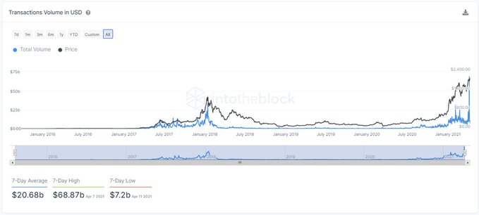 Blockchain analytics platform IntoTheBlock gathered data on Ethereum transactions with volumes greater than $100,000. The portal noted that the second-largest blockchain network processed $20.68 billion worth of transactions in the week ending April 11, leading to a record high volume transfer of $68.87 billion.