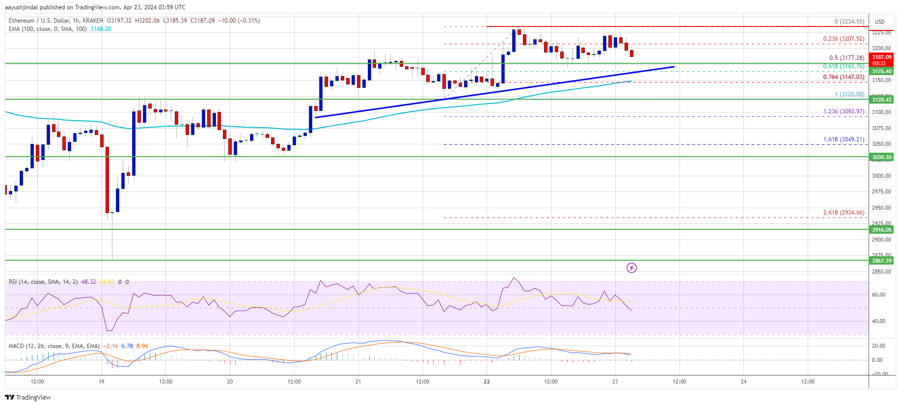 It traded to a new weekly high at $3,234 and is currently consolidating gains. There was a minor decline below the $3,200 level. Ether dipped below the 23.6% Fib retracement level of the recent increase from the $3,120 swing low to the $3,234 high.