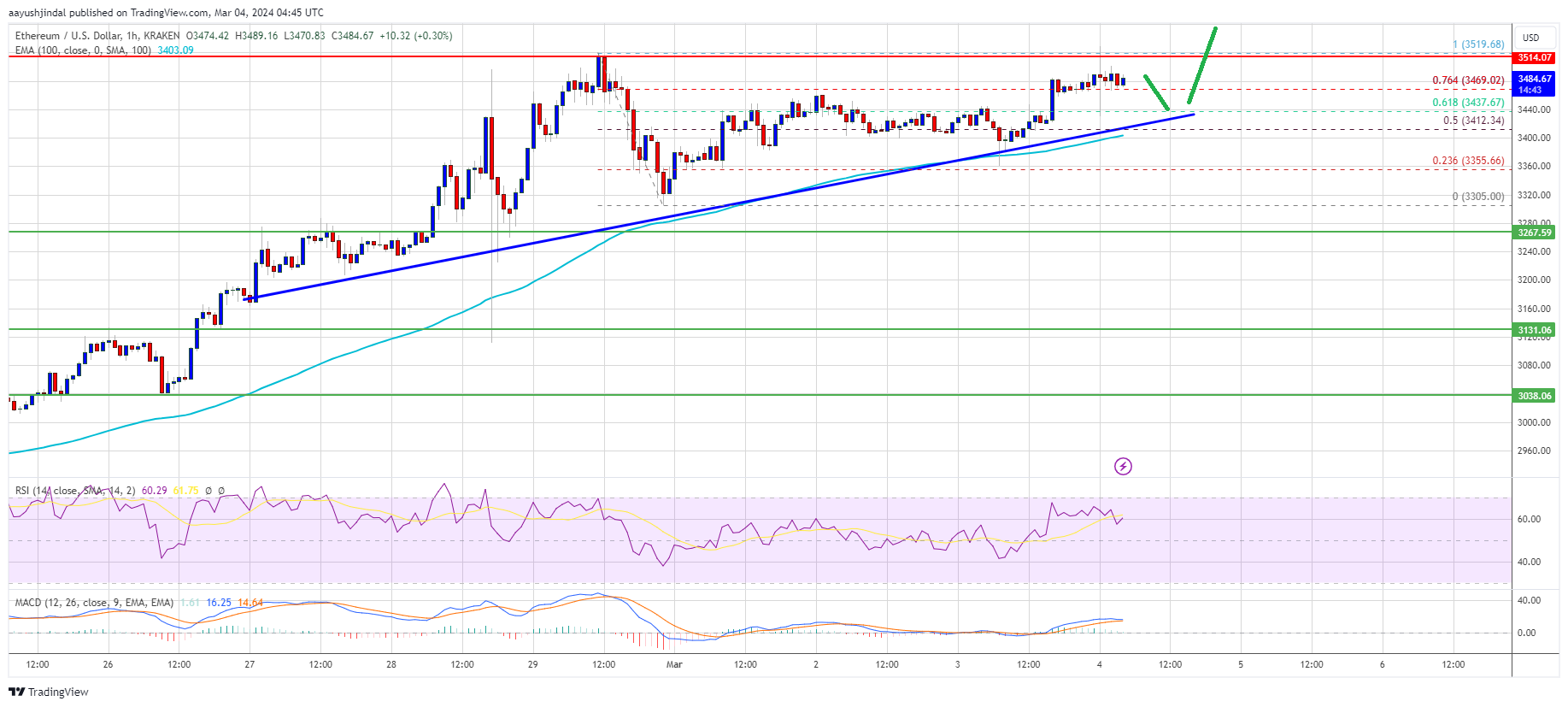 If Ethereum fails to clear the $3,520 resistance, it could start a downside correction. Initial support on the downside is near the $3,420 level and the trend line.