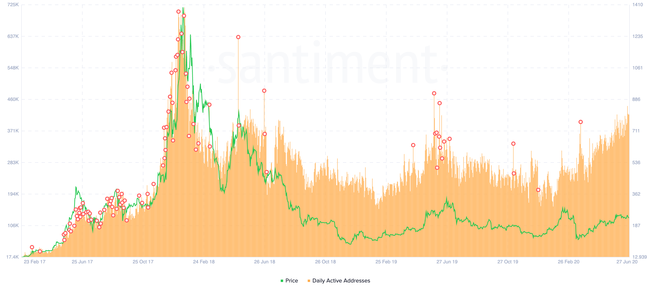 “The number of daily addresses interacting with ETH has spiked in the past 24 hours to a 2-YEAR SINGLE DAY HIGH of 486,000 addresses! The last time Ethereum’s address activity was this high was on May 5th, 2018,” said Santiment.