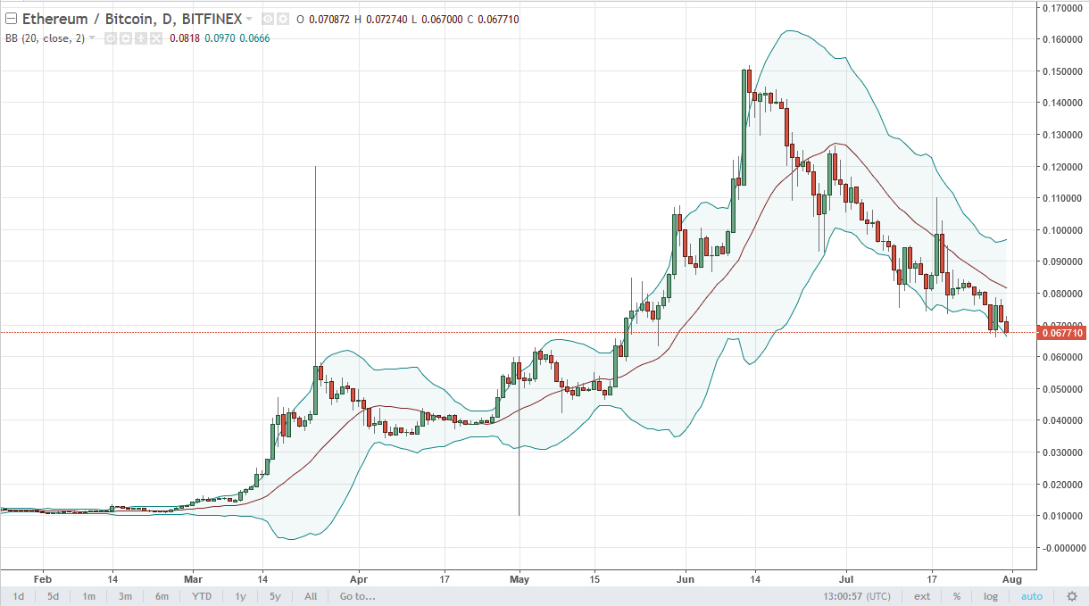 Ethereum continues to slide against Bitcoin, and it looks very likely to go looking towards the 0.06 level now. Short-term rallies are probably selling opportunities, less of course we can break above the 0.08 level above. If we do, then it becomes a very bullish market but currently it looks as if we have a slightly negative attitude.
