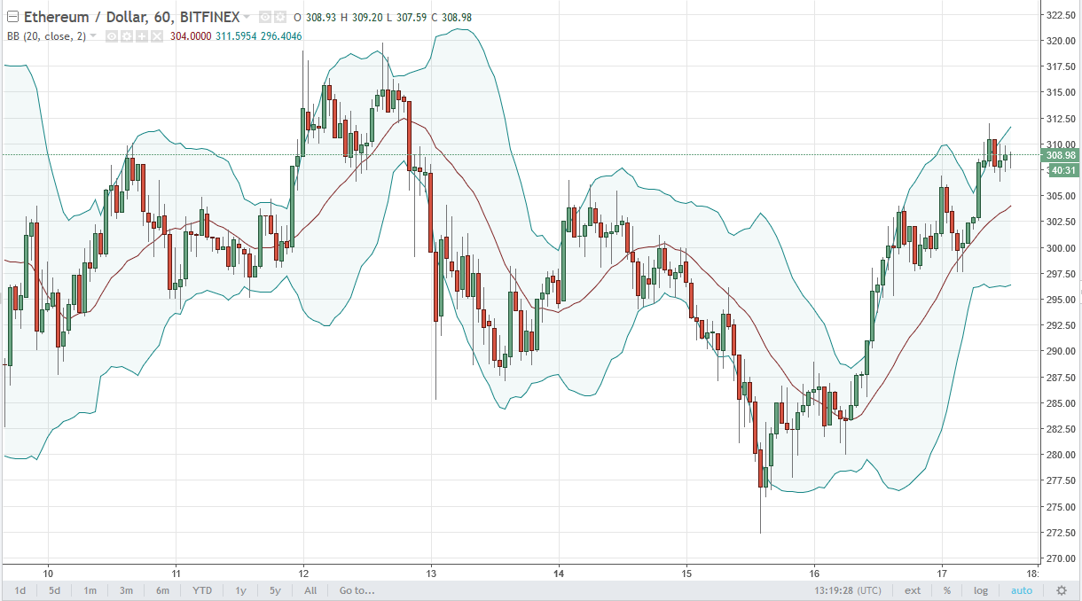 Ethereum pulled back slightly during the session on Thursday, but then shot much higher. Now that we are at the $310 level, the market looks ready to continue to go much higher. However, I think that the market will find buyers on pullbacks, and that’s how I would buy this market, on the dips. Ultimately, I expect this market to go looking towards the $320 level.
