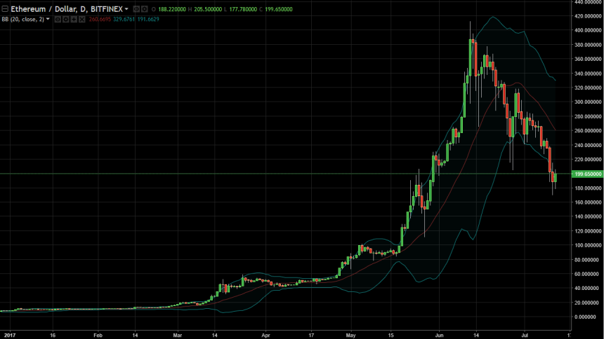 Ethereum fell a bit during the day at the open on Wednesday, but found enough support at the $180 level to turn around and reach towards the $200 level. Quite frankly, if we break above the $220 level, it could be a buying opportunity, but until then, I would be very hesitant to put money to work in a market that looks very broken.