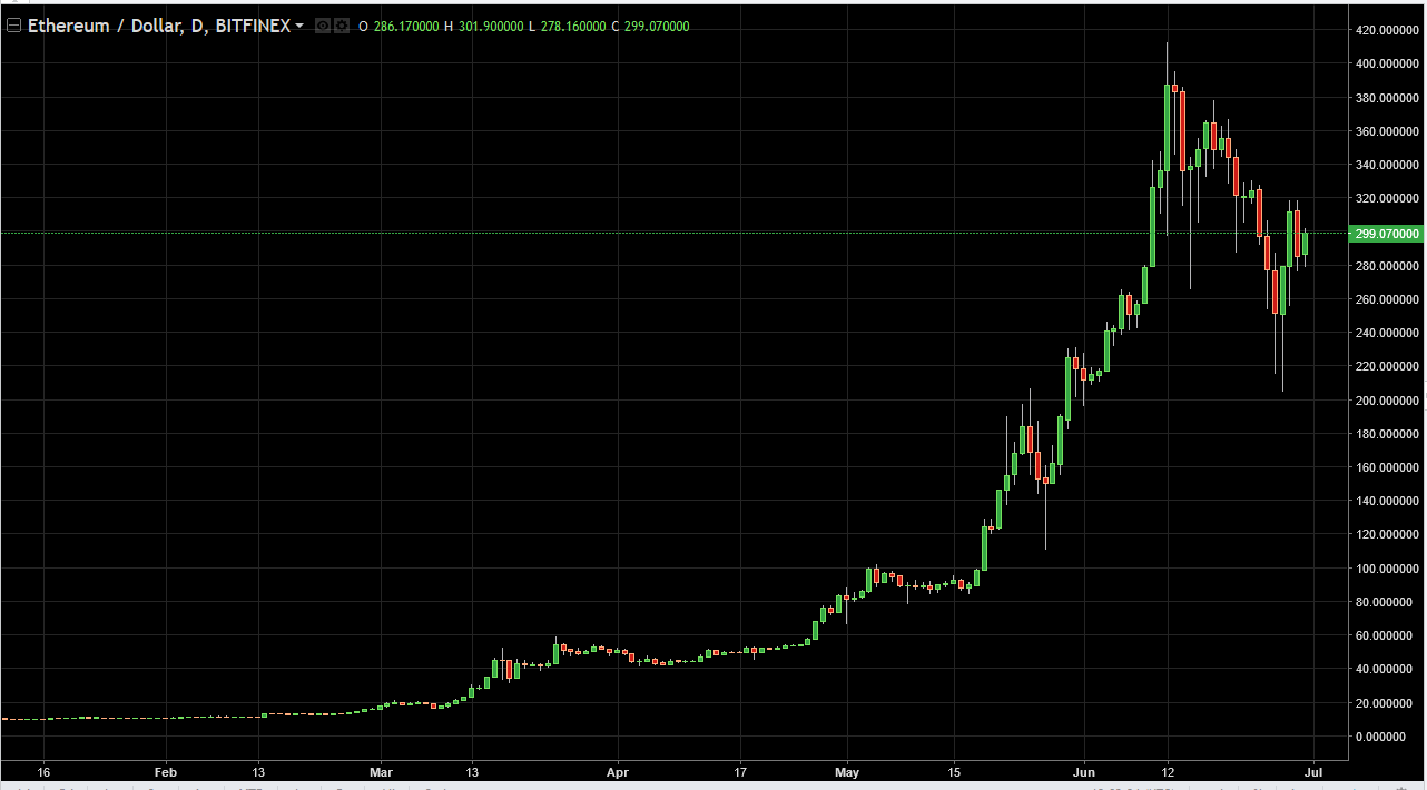 Ethereum initially fell on Friday but found enough support at the $280 level to turn around and show signs of life again. It looks as if we are trying to consolidate and build up enough momentum to continue going higher, and a break above the $320 level is a sign that we are going much higher. In the meantime, it’s probably best to buy short-term dips.