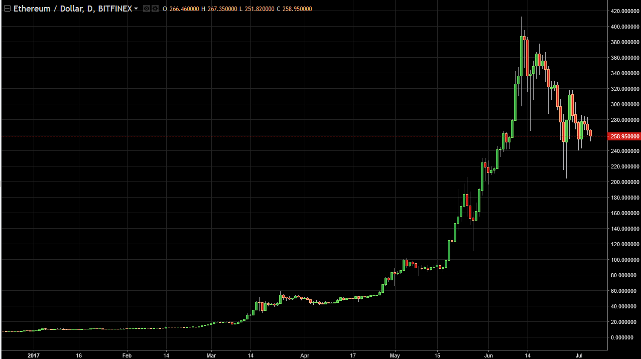 The Ethereum market fell slightly during the session on Wednesday, breaking below the 260 level. However, there is enough support underneath that the $240 level to keep the market afloat as far as I can see, so I believe that buying small positions will probably be the best way to go going forward. Eventually, I expect to see Ethereum break above the $300 level, and continue to go much higher. I look at this is an accumulation phase.