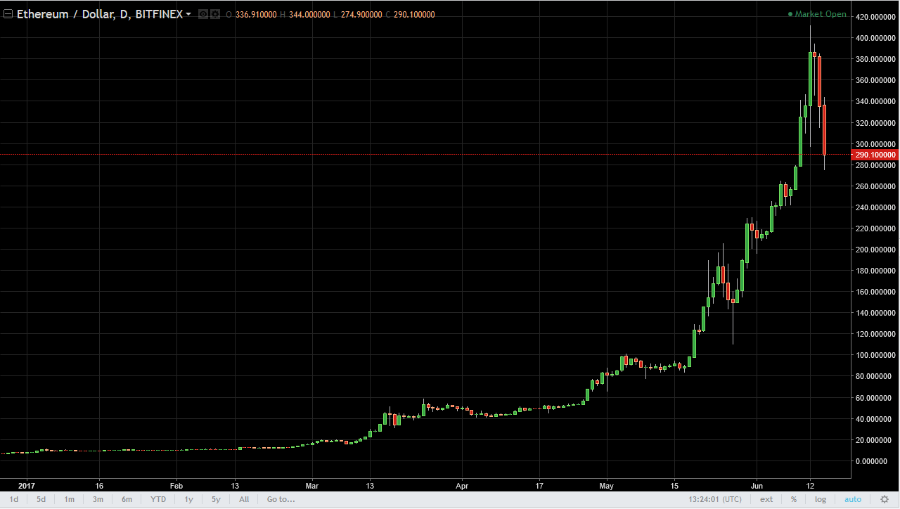 Ethereum continues to sell off, as the Wednesday session was just as bad as the Tuesday session. We tested the $280 level, but quite frankly I think we go farther to the downside from here. This chart has been parabolic for some time, and because of that the selling becomes vicious. I would need to see some type of stability on the daily chart to begin to think about buying, and believe that we could be looking at a move down to the $250 level next.