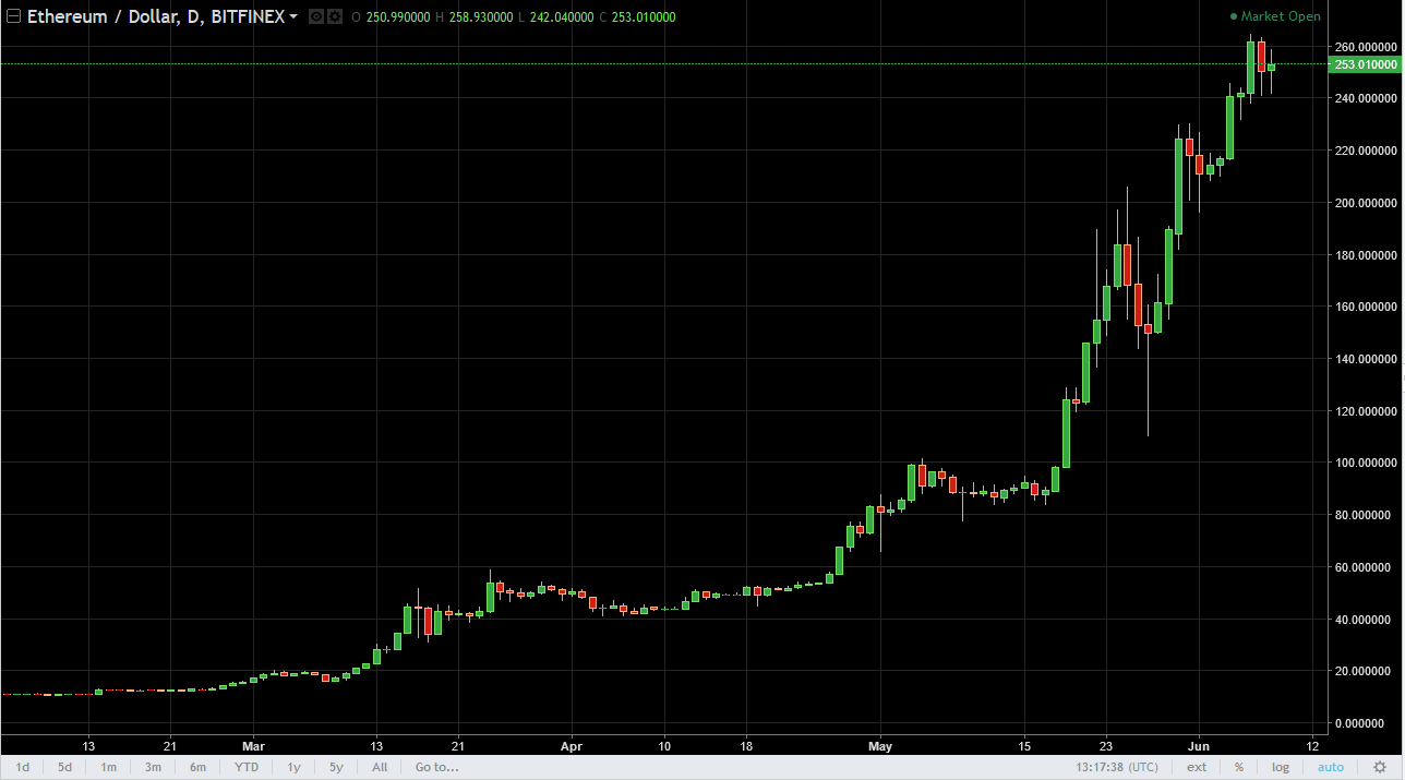 Ethereum initially fell against the US dollar but found enough support at the $240 level to turn around and form a slightly positive candle. Because of this, looks as if the buyers are underneath and willing to take advantage of dips as they offer support. The $240 level looks to be very interesting in general, and I believe that the markets should continue to find buyers on dips to that region. The $260 level above offers resistance, but it seems as if it is only a matter of time before we break above there.