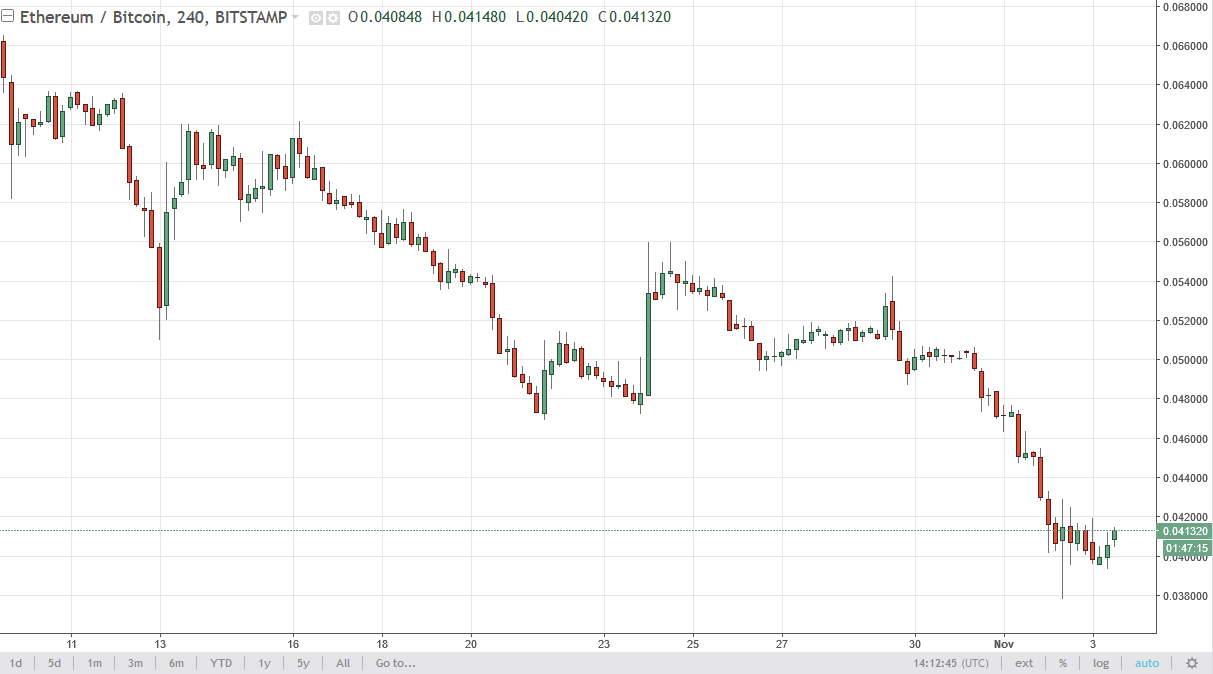 Ethereum rallied a bit against Bitcoin, as we have seen a little bit of life in this general vicinity. The 0.042 level has acted as resistance, and at the first sign of exhaustion I’m more than willing to sell. It’s not that I don’t like Ethereum, it’s just that Bitcoin has been exploding to the upside for some time. Wait for a roll over, and start selling again.
