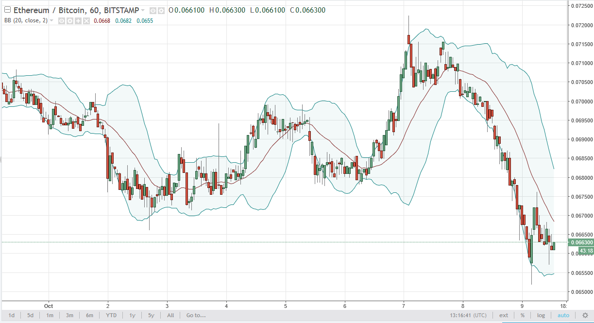 Ethereum initially rallied on Monday, but then pulled back to find support. If we can break down below the 0.650 level, the market could go much lower. Given enough time, I believe that the market probably continues to drift lower, but I don’t expect Ethereum to collapse against Bitcoin. The market is one that is probably best played to the short side and for the short term. Beyond that, I don’t see much in the way of trading opportunities.
