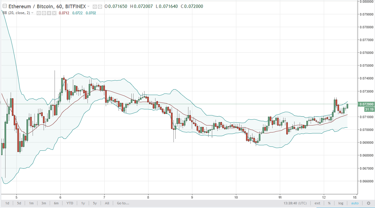 Even though longer-term I prefer Bitcoin over Ethereum, it does look bullish in the short term. The 0.071 level has offered support, and I think we will go looking towards the 0.074 handle. Ultimately, this is a market that I think will continue to grind higher over the next couple of sessions, but I believe that owning Bitcoin will turn out to be the better of the 2 currencies over the longer term.