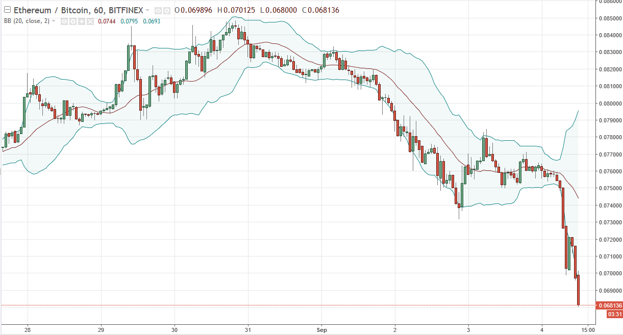 Obviously, Ethereum has lost value against Bitcoin as well, because Bitcoin has the advantage of being the biggest crypto currency. Monday has seen a loss of over 10% already, and it looks as if the selling is going to continue. Stepping away from this currency pair is probably the smartest thing you can do.