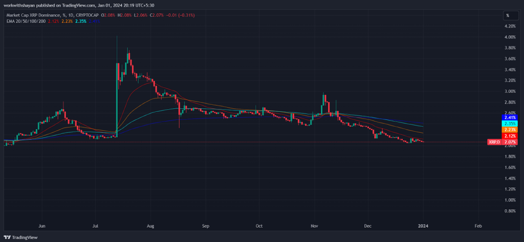 Meanwhile, since November, XRP’s market dominance has decreased; at 2.07%, it is currently trading below that level.